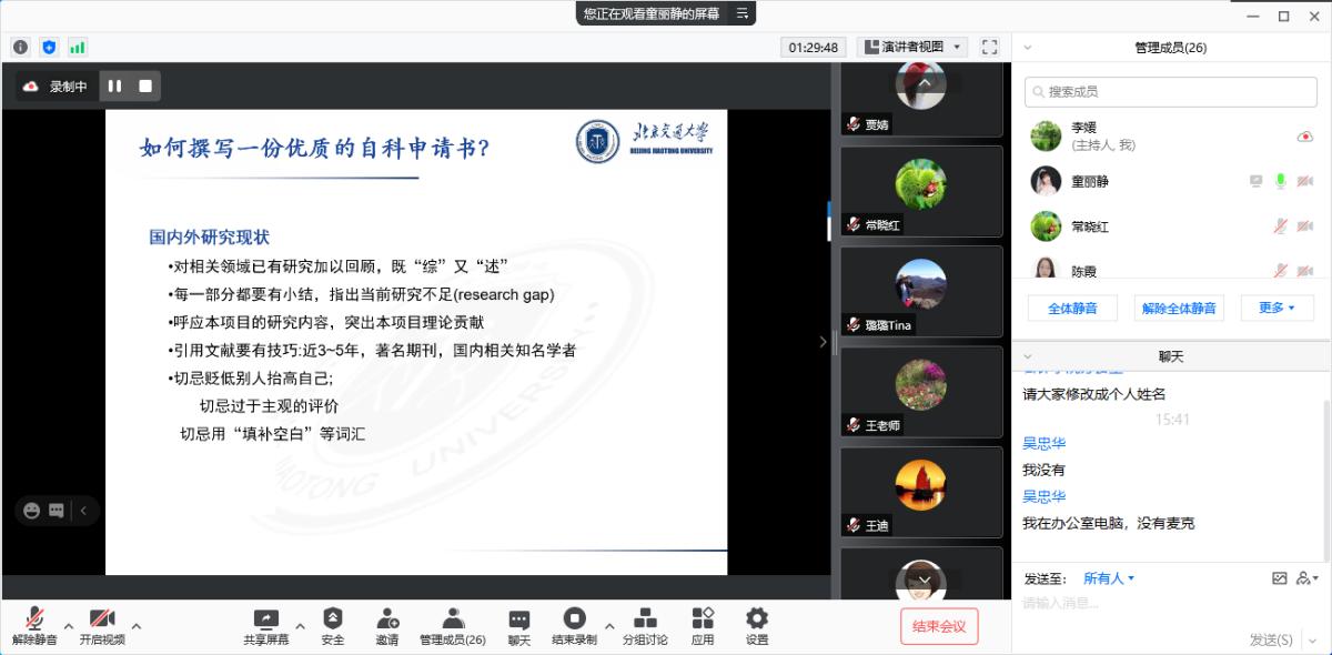 10月27日下午, av99 举办“关于国自科青年基金申请”交流会,邀请北京交通大学经管学院童丽静博士进行讲座,讲座采取腾讯会议形式召开, av99 部分教师和研究生参加了会议。