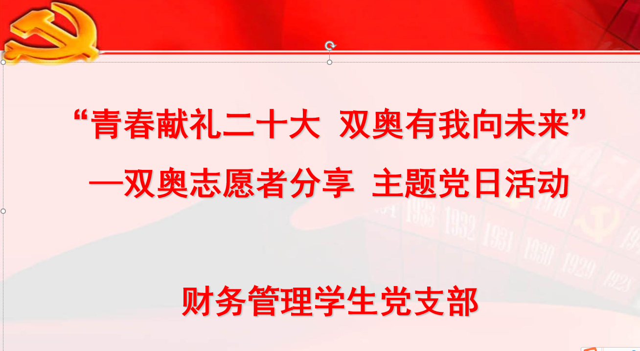 财务管理学生党支部组织召开“青春献礼十二大 双奥有我向未来”双奥志愿者分享主题党日活动,党支部全体党员、财务管理专业各年级学生参加,活动由党支部书记刘娜老师主持。