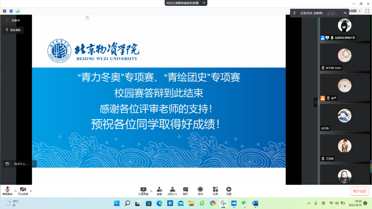 为了提高广大青年学子的创新创业创造能力,北京物资学院于4月14日下午3:00开展2022年挑战杯“青力冬奥”专项赛、“青绘团史”专项赛校园赛答辩。本次校园赛由 av99