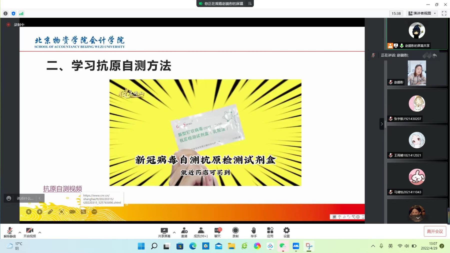 接着,赵御彤老师通过一段视频,向大家介绍了抗原自测方法。视频完整的介绍了试剂盒所包含的物品、鼻拭子的操作过程以及检测卡的显示说明。很大程度的方便了同学们居家进行自测。