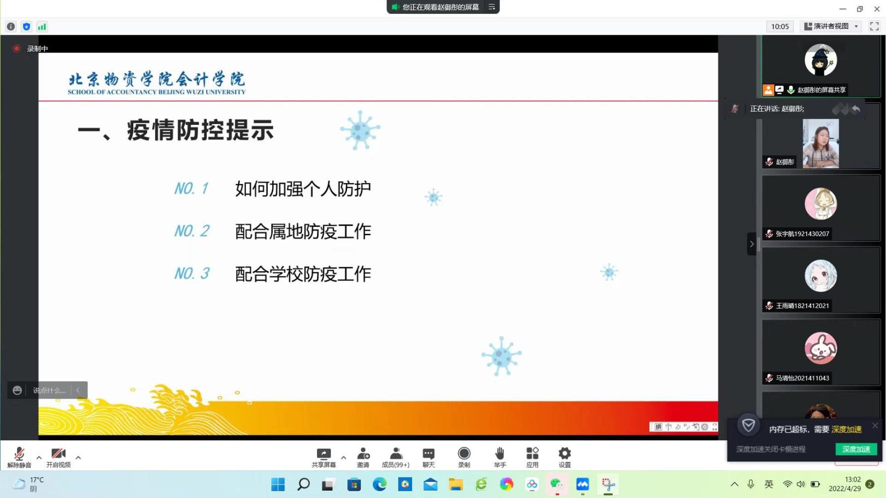 首先,赵御彤老师就如何“加强个人防护”、“配合属地防疫工作”、“配合学校防疫工作”这三方面对疫情防控做出提示。赵御彤老师呼吁大家积极完成疫苗接种,并且按照社区的要求配合防疫工作,做到不传谣,不信谣,同时,按时完成每日健康打卡,配合疫情防控工作的开展。