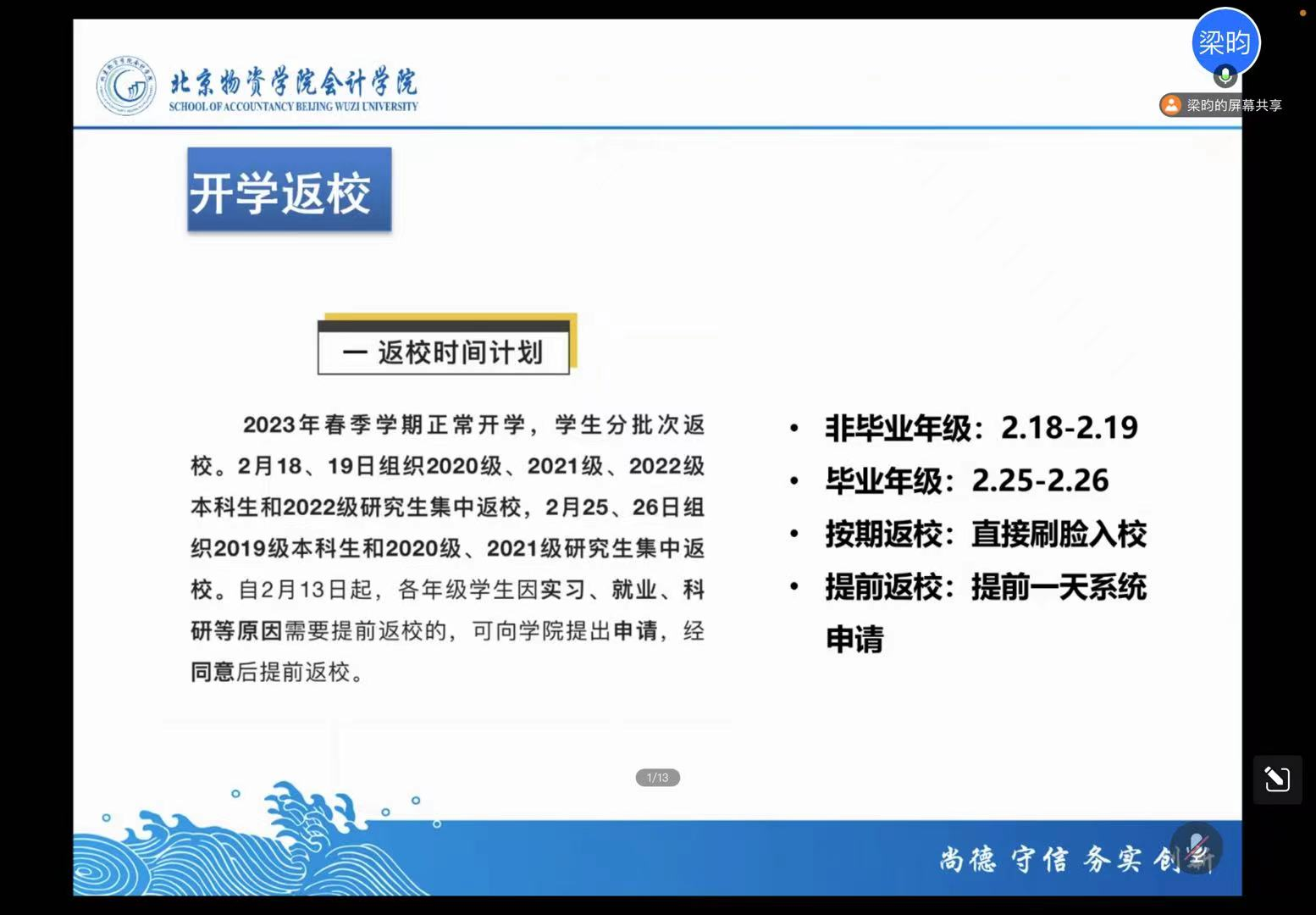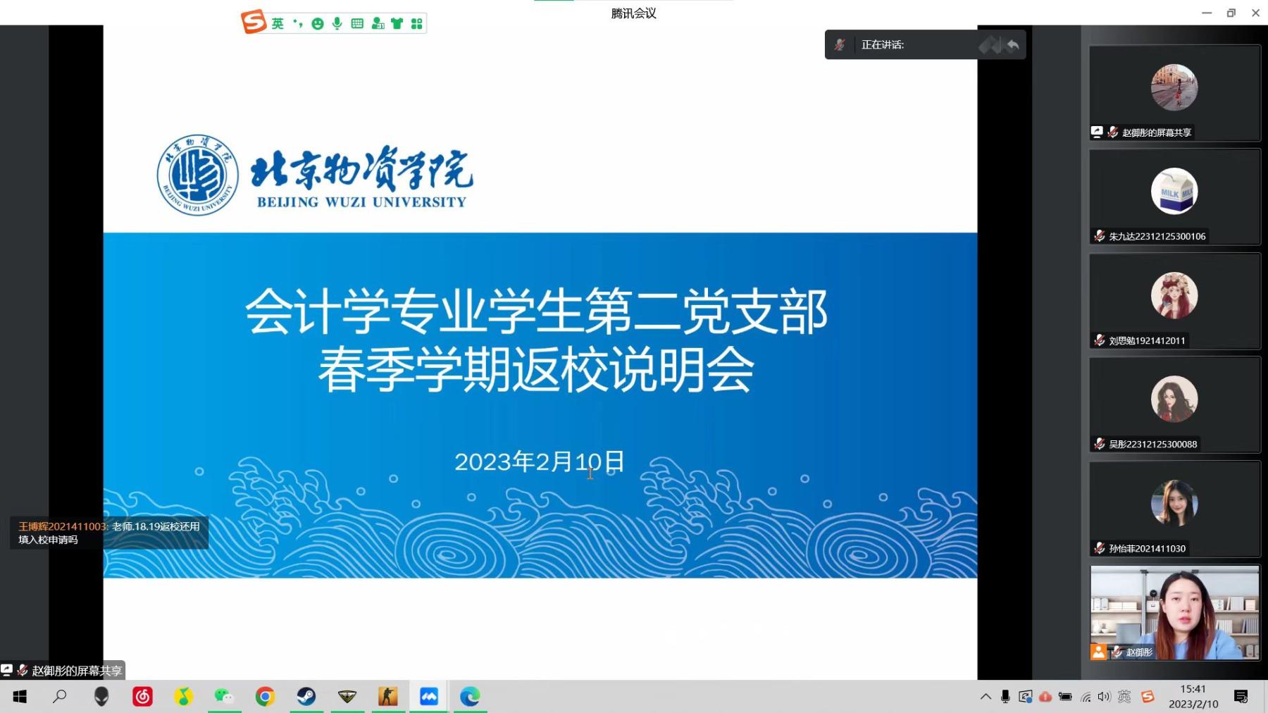 首先,各位学生党支部书记(辅导员)从2023年春季学期返校政策的制定背景出发,向同学们阐释了“分批分期、错时错峰、稳妥有序”的工作方针,为学生详细介绍了春季学期返校的具体事宜,要求各位同学按照学校要求按时返校,有异常情况需要及时与辅导员老师取得联系。