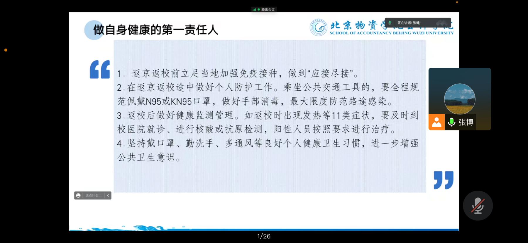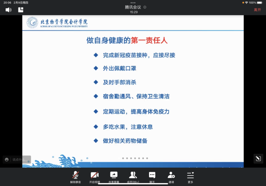 随后,各位学生党支部书记(辅导员)从病毒变异情况、当前国内疫情形势、我国疫情防控基础等角度出发,对新冠病毒感染从“乙类甲管”调整为“乙类乙管”的现实原因进行了全面解读。各位老师对返校前、返校中、返校后的健康及安全注意事项与学生进行了强调,提醒同学们要切实做好自身健康的“第一责任人”,如:学生们要高度重视新冠肺炎疫苗的接种工作,做到应接尽接;返校要认真佩戴口罩,降低疫情感染风险;返回宿舍后要勤通风、常打扫,做好公共区域卫生;劳逸结合、适量运动,提高自身对于病毒的抵抗能力。