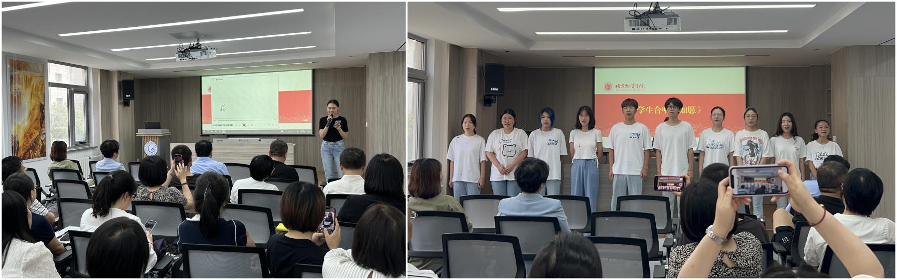 的老师们合唱了一首歌曲《如愿》。学生们充满热情地唱出了每一个音符、每一句歌词,他们都以最大的诚意和对老师的深深敬意来演唱这首歌曲,希望每一位老师都能如愿以偿,实现自己的职业理想,也祝福老师们的工作和生活都能充满幸福和快乐。在场的老师们都被深深地感动了,认为这是学生对教师的一种非常特别的节日礼物,并对学生们的合唱致以热烈的掌声。教职工代表王妤也演唱了一首《长大后我就成了你》,“长大后我就成了你,才知道那个讲台,举起的是别人,奉献的是自己”道出了莘莘学子对老师的感恩之情,也表达出作为一名教师的自豪与价值。