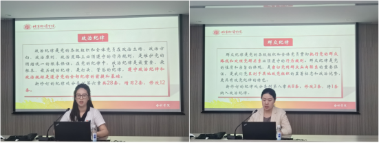学生第四党支部书记王鹏莉老师、学生第二党支部书记赵御彤老师以“以案说纪” 微党课的形式,结合教育系统违纪案例,讲述了党的“六大纪律”的内容,特别是违反“六大纪律”行为的违纪情形和处分结果,并对如何做到遵纪守法、干好本职工作提出纪律提醒。