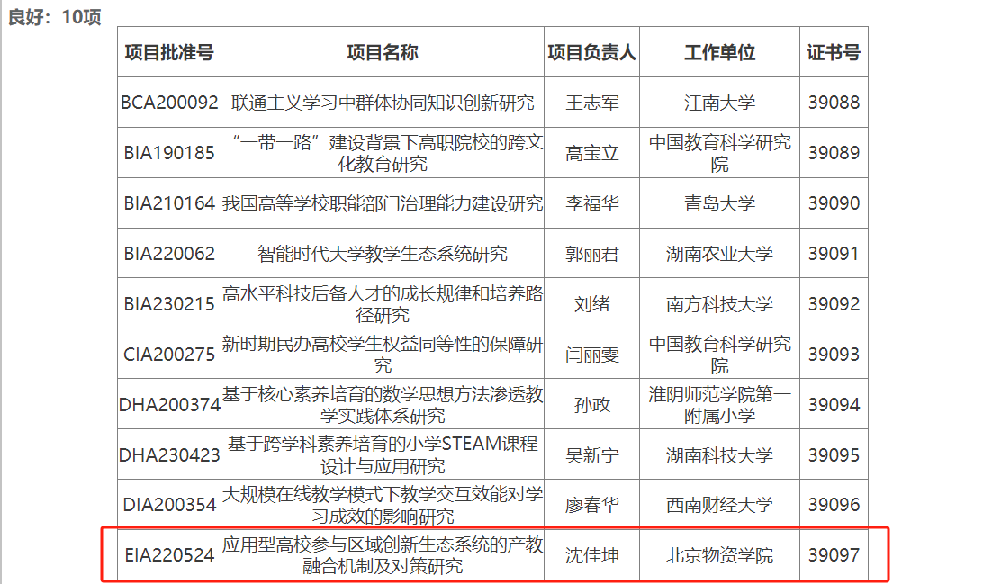 沈佳坤副教授主持的全国教育科学规划教育部青年课题《应用型高校参与区域创新生态系统的产教融合机制及对策研究》(EIA220524)顺利结项,结项成果经同行专家鉴定,获得“良好”的等级评定。据统计,截至目前,本年度全国教育科学规划领导小组办公室共验收613个项目结项申请,最终,530个项目予以结项,其中免于鉴定27项,优秀19项,良好133项。