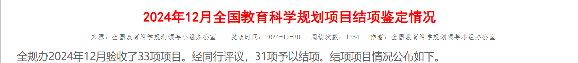 近日,全国教育科学规划领导小组办公室发布《2024年12月全国教育科学规划项目结项鉴定情况》,av99