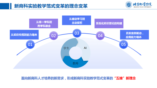 报告过程中,张闯教授介绍了北京物资学院的改革探索和实践经验,包括强化基础、高标准建设《人工智能导论》通识课,学科交叉共融、打造智慧物流新兴交叉学科,需求牵引、产教融合重构人工智能赋能实践教学场景,多元协同、政产学研用五位一体构建实验教学新生态。最后,张闯教授提出以AI为翼,拥抱新商科教育变革,为培养未来商业创新人才开启全新篇章。