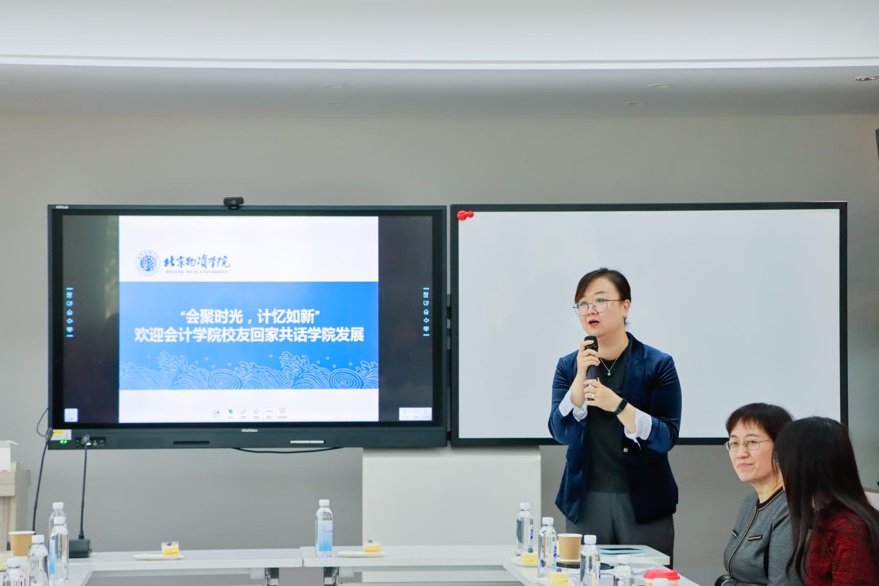 党委书记刘艳荣致欢迎辞,刘书记代表学院全体师生对校友们的到来表示最热烈的欢迎。她指出学院发展离不开广大校友的长期支持,并诚挚邀请校友常回校交流,为学院高质量发展建言献策,助力人才培养工作再上新台阶。她表示校友是学院最宝贵的财富和最亮丽的名片,学院今日的成就凝聚着历代会计人的心血与智慧。