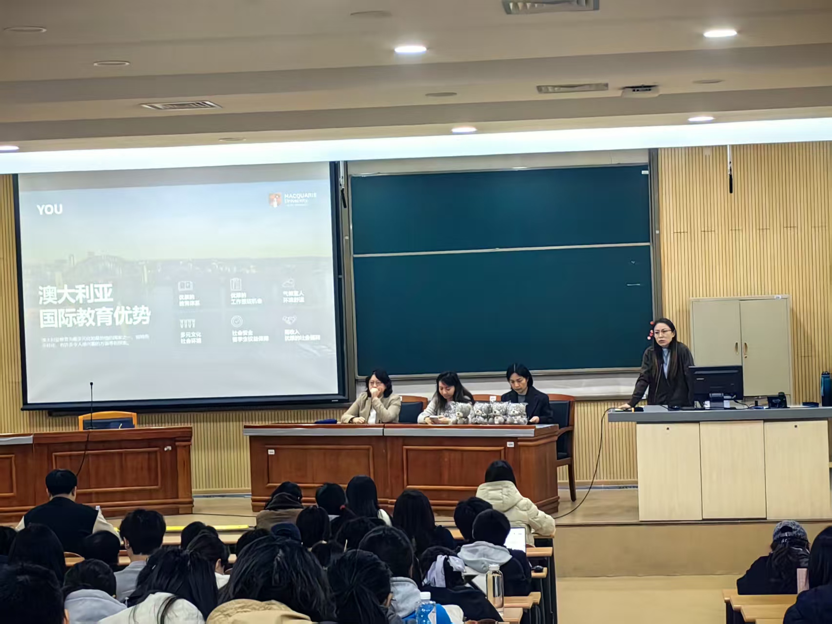 联合国际交流中心在二教第一报告厅举办澳大利亚麦考瑞大学本硕连读项目解析会。麦考瑞大学未来学生事务部中国院校事务主管蒋婷婷女士、项目老师Angela Tian与Carina Wang莅临主讲, av99