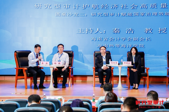 在圆桌论坛环节,杨超教授作为特邀嘉宾发表了主题观点。他指出,未来国家治理正加速从“规则驱动”迈向“算法驱动”,从“经验治理”转向“证据治理”,治理范式的深刻变化对审计研究提出了新的时代命题。审计学界必须主动面向国家治理现代化需求,以信息治理、数智技术、制度创新为核心视角推动研究型审计的发展。他系统分享了研究型审计在提升国家治理效能中的作用机制,并进一步阐述了在“十五五”规划背景下,审计在服务“数智中国”建设、促进“绿色发展”战略落地等方面的重要使命。