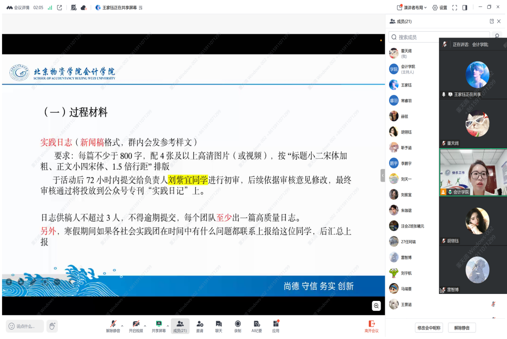 为进一步提升实践实效性,会议特别设置了经验分享环节。2025年校级暑期社会实践一等奖团队“运河文脉传薪队”代表刘天一同学结合团队在通州运河文化传承中的成功实践,分享了实战心得与宝贵经验。刘天一同学从主题把握、资源对接、成果凝练等关键维度切入,通过展示详实的实践纪实与丰富的转化材料,生动还原了优秀社会实践从策划到落地的全流程。她特别针对如何挖掘地方特色资源、高效开展实地调研、撰写高质量调研报告等同学们普遍关心的问题,给出了具体可行的操作建议,为即将出征的团队提供了极具参考价值的实践范式。