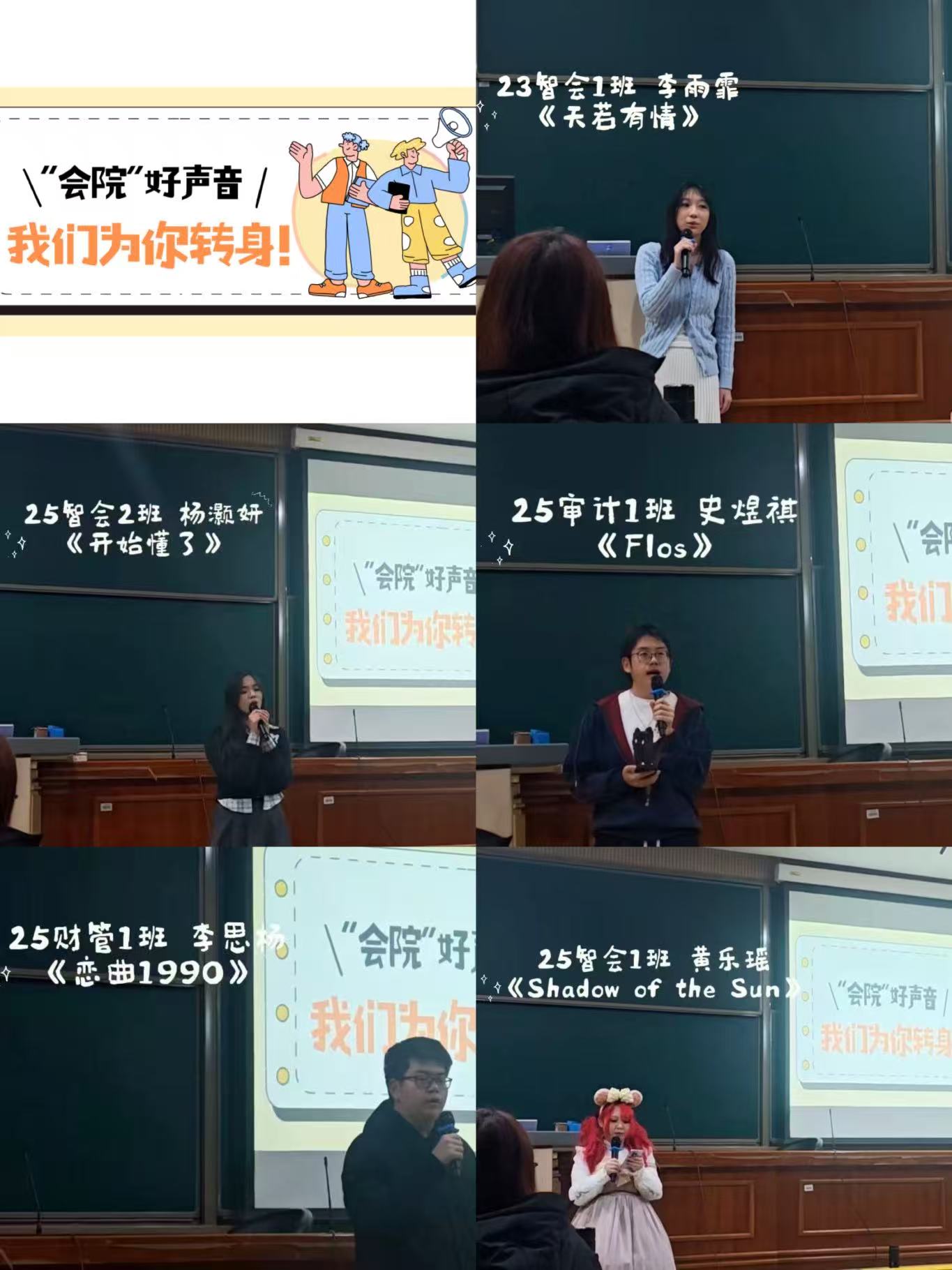 系列活动在“春日歌单征集”中温情开启,近60名同学用心选取并分享了属于自己心中的春日旋律,以音乐传递情感,用音符书写青春故事。随后举办的“会院好声音”歌唱比赛将活动推向首个高潮,参赛选手在舞台上倾情演绎,用真挚的歌声打动人心,现场约100名观众积极参与互动,共同营造了热情洋溢的艺术氛围。