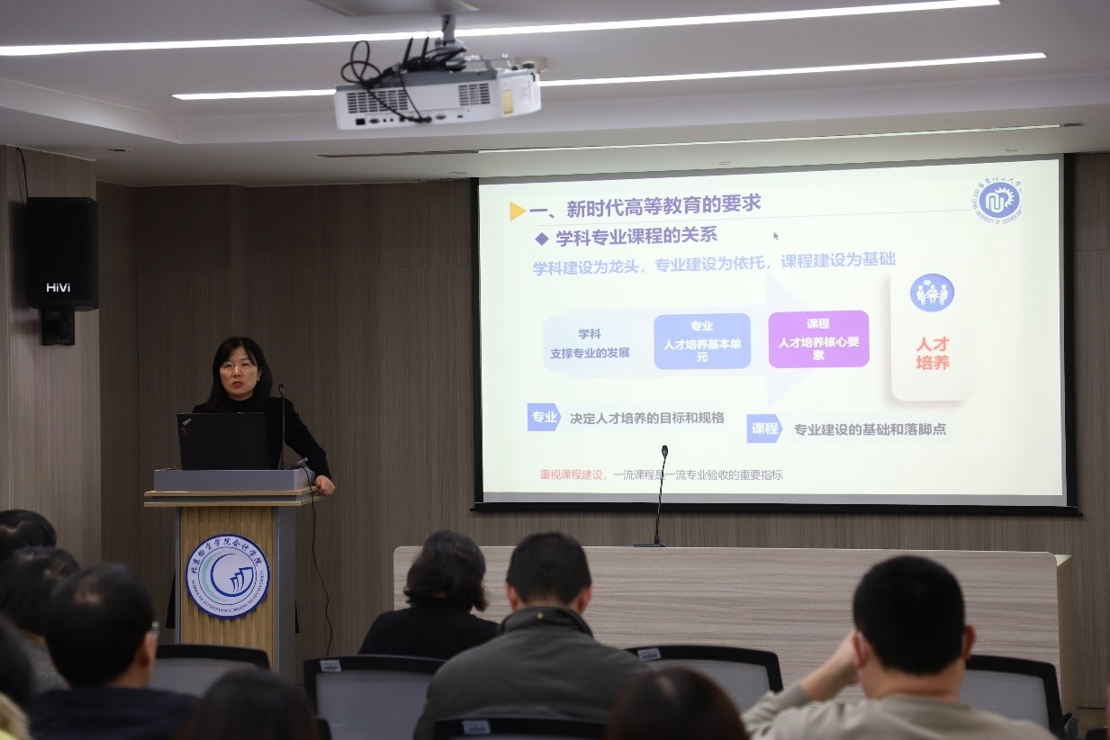 2023年国家级一流课程实行分类申报,分为线上、线下、线上线下混合式、虚拟仿真和社会实践等五类。申报推荐课程须至少经过两个学期或两个教学周期的建设和完善,取得实质性改革成效,在同类课程中具有鲜明特色、良好的教学效果。王美英副院长从新时代高等教育的要求、一流课程的内涵建设和特征三个方面,为全体教师解读了2023年国家级一流本科课程申报相关要点。一流课程应突出以学生为中心、注重能力培养,她建议老师们通过深化课堂教学改革来加强课程建设,注重教学团队建设,善用现代化教学手段呈现教学效果,有效融入课程思政元素,推进课程的高阶性、创新性和挑战度建设,切实提高课程育人质量。