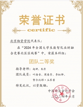 由中国商业会计学会主办、江苏理工学院承办、厦门九九网智科技有限公司技术支持的“2024年全国大学生数智化业财融合竞赛”区域赛和总决赛分别于5月25日和6月1日线上成功举行。在指导老师赵妍和朱丹的带领下,由叶海音、周春芳、李虹烨和努尔比耶·玉苏普四名同学组成的本科团队在区域赛当中脱颖而出取得好的成绩,荣获北区二等奖;由李欣雨、李璐瑶、梁舒晴和王璐四名同学组成的研究生团队在总决赛中同样表现出色,荣获全国总决赛二等奖。