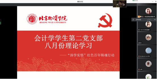 为进一步提高支部党员的思想觉悟、加强党员党性修养,会计学专业学生第二党支部于8月29日17时在腾讯会议召开线上8月份理论学习党课,会议由支部组织委员主持,支部书记赵御彤老师和支部全体党员一同参加。