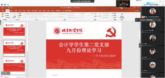 为进一步提高支部党员的思想觉悟、加强党员党性修养,会计学专业学生第二党支部于9月27日17时在腾讯会议召开线上9月份理论学习党课,会议由支部组织委员主持,支部书记赵御彤老师和支部全体党员一同参加。
