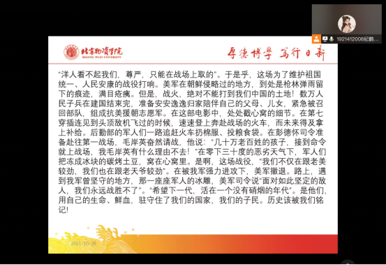 首先是支部赵海舟同学进行分享,其次是纪鹤洋同学,两位同学的感想中都描述了一些自己印象比较深的电影镜头,感叹我们现在的辛福生活来之不易,无数英雄前辈们用自身性命换来了如今的和平年代,我们应铭记历史,不忘初心,努力提升自己,争取日后为国家作出更大贡献。