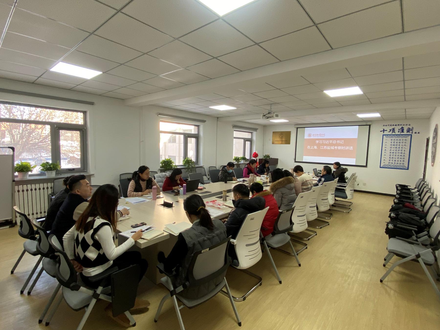 党委纪检委员许海晏领学习近平总书记在上海、江苏盐城考察时的重要讲话精神。许老师详细解读了习近平总书记对上海聚焦建设国际经济中心、金融中心、贸易中心、航运中心、科技创新中心的重要使命的指示,结合学院专业发展谈了自己的体会。
